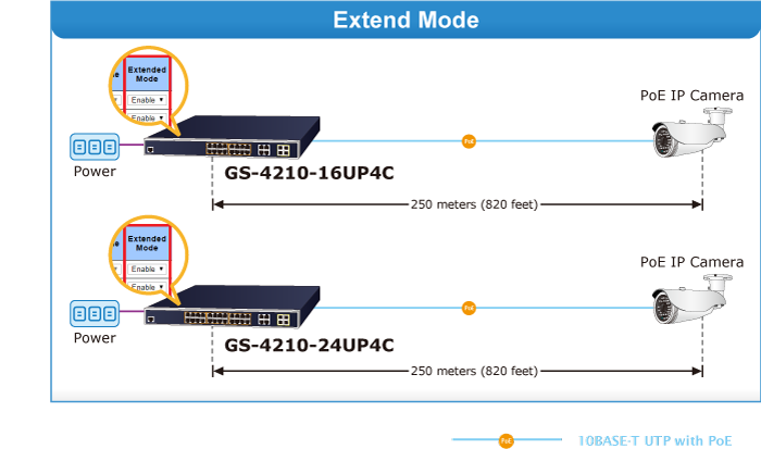 En el modo de funcionamiento "Extendido", el GS-4210-16UP4C funciona por puerto a una velocidad dúplex de 10 Mbps, pero puede admitir una salida de alimentación PoE de 50 vatios a una distancia de hasta 250 metros, superando el límite de 100 m del cable UTP Ethernet. Con esta nueva función, el GS-4210-16UP4C proporciona una solución adicional para la extensión de la distancia PoE 802.3at/af, ahorrando así el coste de la instalación del cable Ethernet.