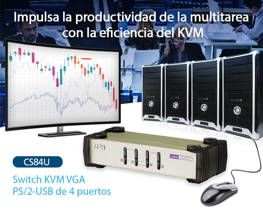El switch CS84U permite acceder rápidamente a un máximo de 4 ordenadores con interfaz VGA a través de una consola KVM. Además, contribuye a ampliar el espacio de trabajo en el escritorio y a mantenerlo ordenado y organizado para mejorar la productividad.